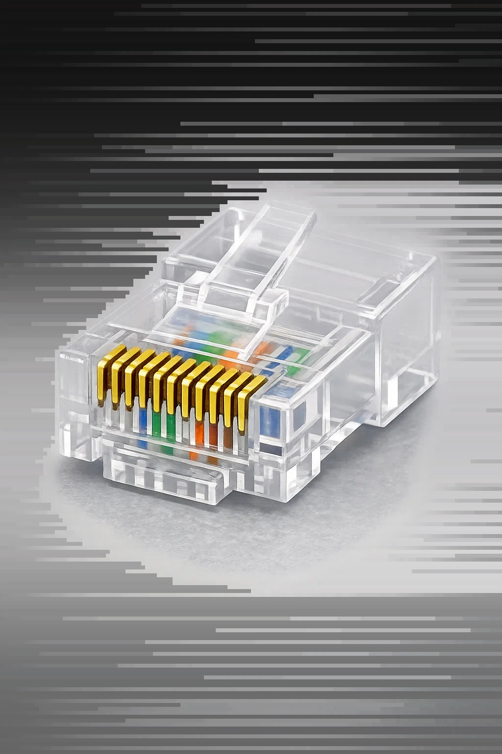 Это неэкранированная модульная вилка 10P8C Cat.5e — это немного «особый» разъем сетевого кабеля. Хотя он очень похож на сетевые разъемы, которые мы обычно видим на компьютерах, в его конструкции есть интересная маленькая деталь.
