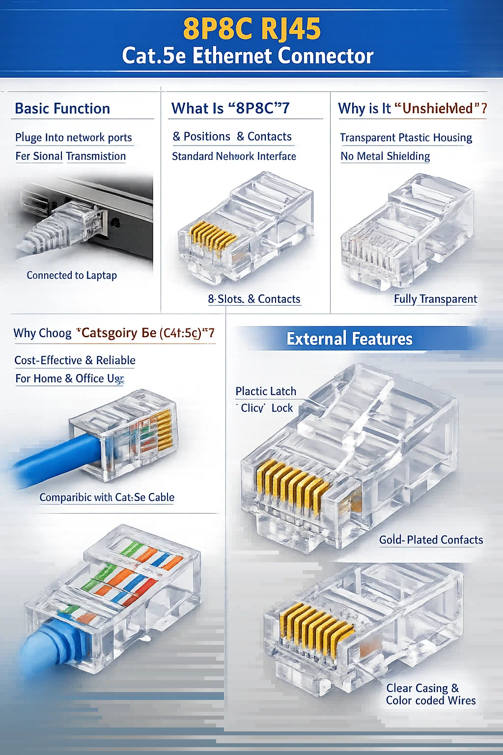 Это неэкранированная модульная вилка 8P8C Cat.5e на самом деле это наиболее распространенный тип «разъема RJ45», встречающийся во многих домашних широкополосных сетях как в прошлом, так и в настоящем. Это прозрачный, компактный и важный компонент для подключения к сети.