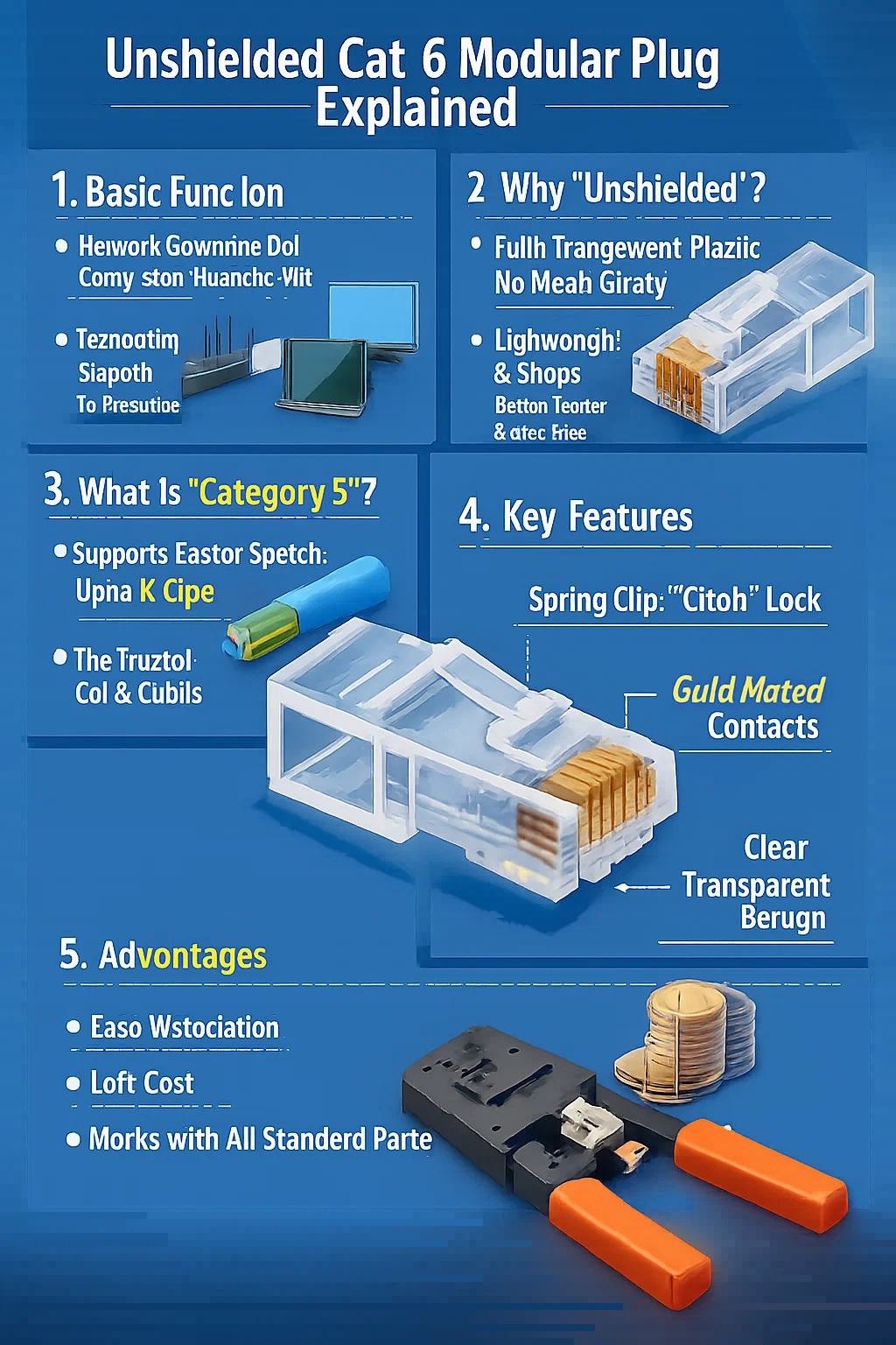 Это неэкранированная модульная вилка Cat.6 на самом деле это самый распространенный тип прозрачного разъема сетевого кабеля, который мы видим каждый день. Если вы держите в руках обычный бытовой сетевой кабель, скорее всего, это прозрачная пластиковая вилка с небольшим пружинным зажимом на конце.