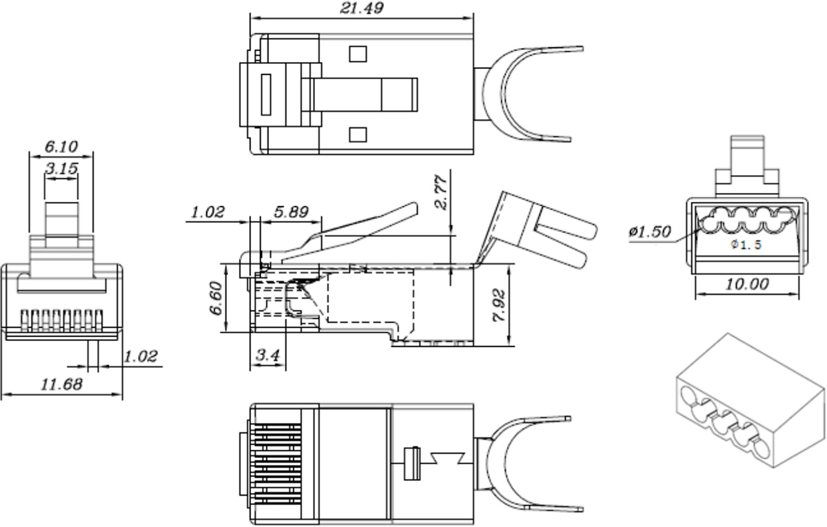 ● Следуйте серии IEC 60603-7 для 8-контактного разъема RJ45.